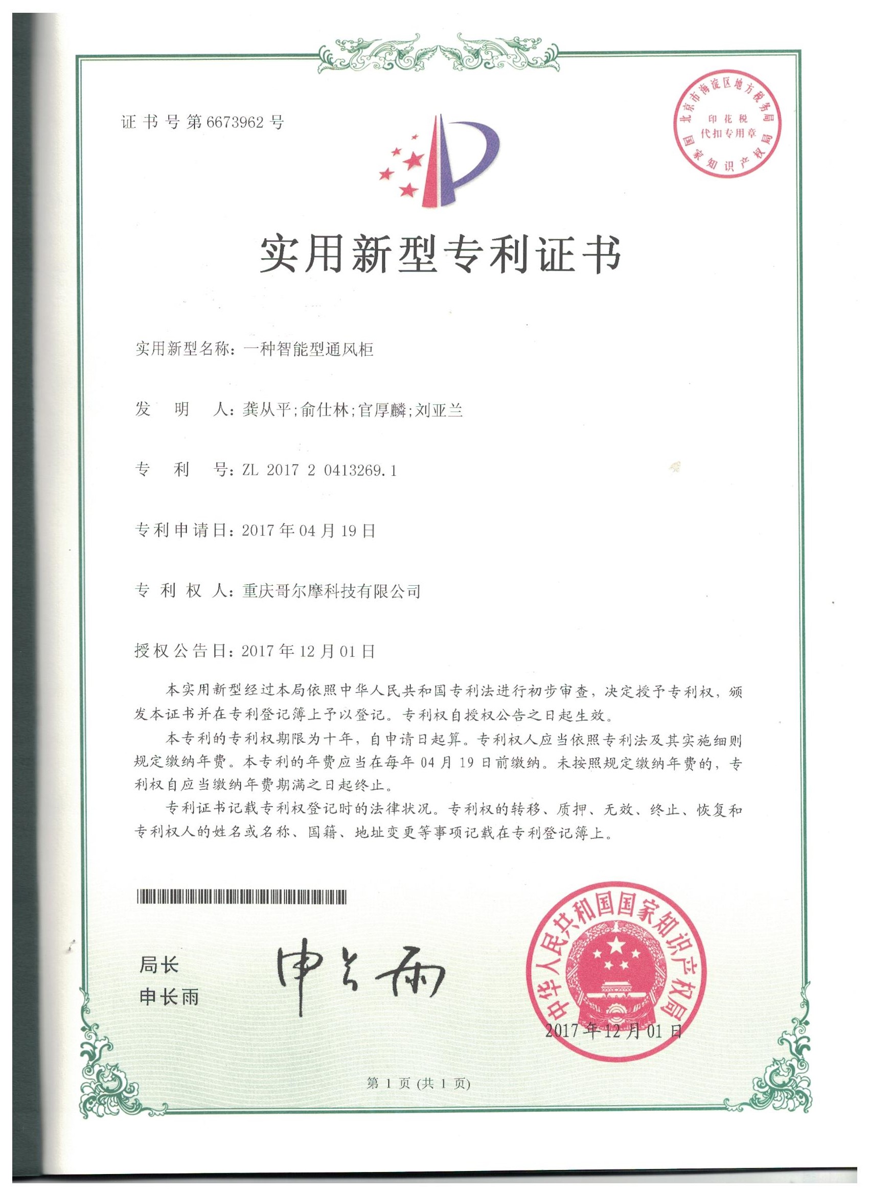 由重慶哥爾摩科技有限公司研究申報的“一種智能型通風(fēng)柜”獲得國家知識產(chǎn)權(quán)局頒發(fā)的實用新型專利證書。