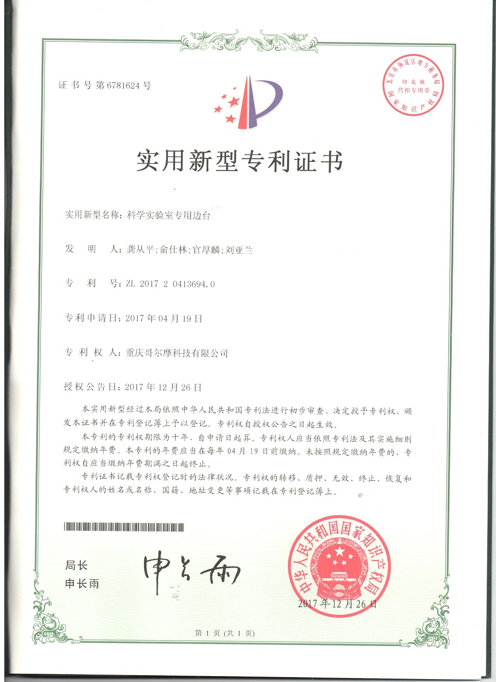熱烈祝賀我公司又獲得一項(xiàng)實(shí)用新型專利《科學(xué)實(shí)驗(yàn)室專用邊臺(tái)》