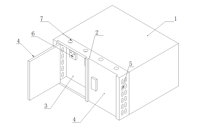 其中1、儀器臺體;2、容納腔體;3、容納腔體內(nèi)部;4、檢修門;5、通風(fēng)孔;6、插座;7、引線孔;8、導(dǎo)線槽;