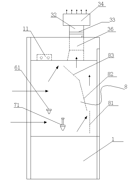 其中1為底柜;2為通風柜柜體, 3為排風單元,31為集風罩,32為排風管道,33為排風調(diào)節(jié)閥門,34為廢氣處理裝置;35為壓力傳感器,36為風機,4為微電腦控制單元,41為輸入單元,42為顯示單元, 5為調(diào)節(jié)窗,6為氣體控制開關(guān),61為氣體閥門,7為液體控制開關(guān),71為液體閥門,8為導流單元,81為第一導流板,82為第二導流板,83為第三導流板,9,聲光報警器,10為面風傳感器,11為熒光燈。