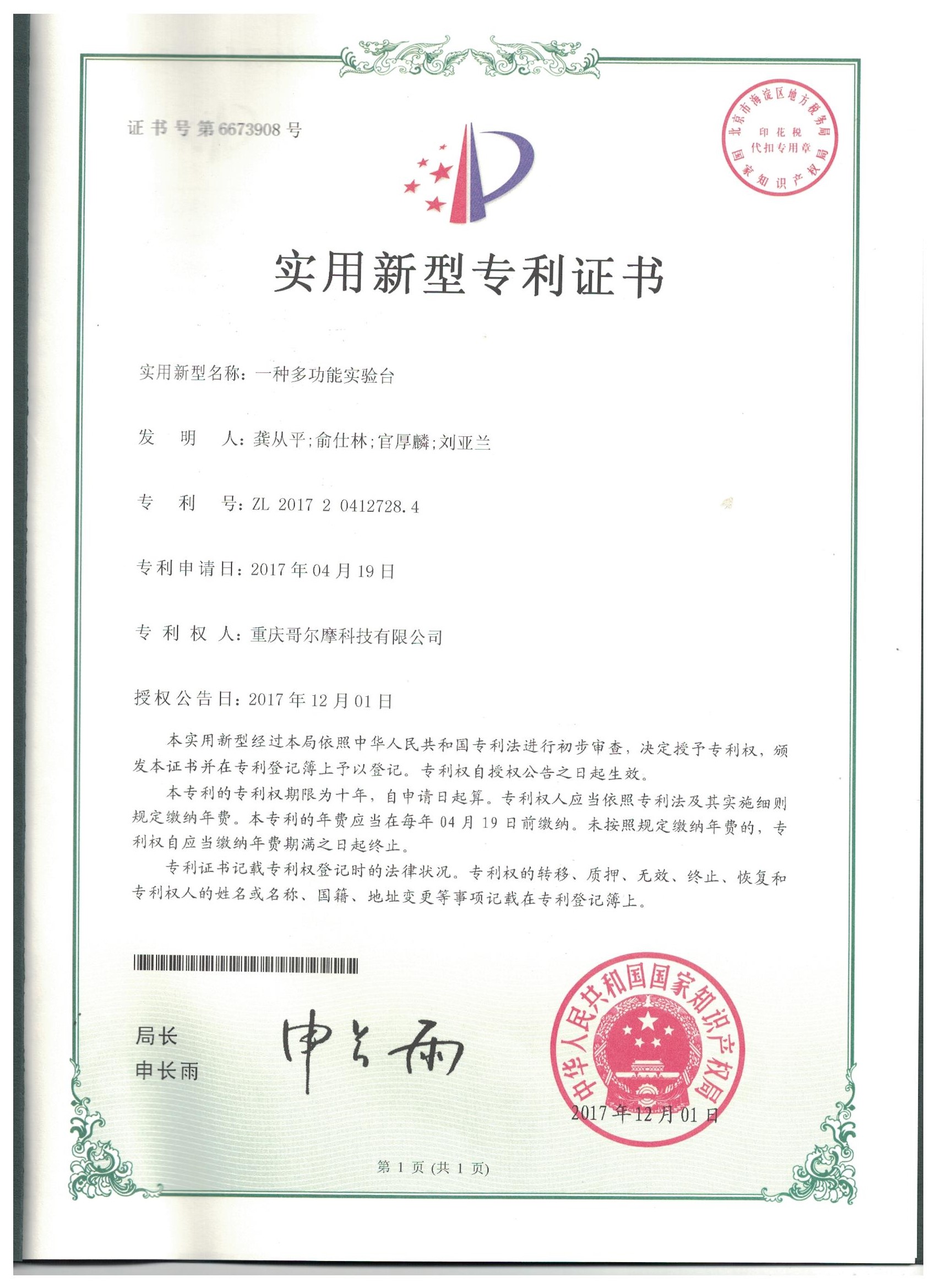 熱烈祝賀我公司榮獲“一種多功能實(shí)驗(yàn)臺”實(shí)用新型專利證書
