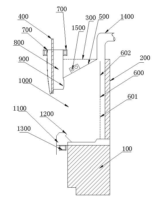 如圖1所示,科學實驗室專用通風柜,包括通風柜本體,所述通風柜本體包括第一側(cè)板、第二側(cè)板、頂板300、工作臺100、背板200,第一側(cè)板和第二側(cè)板分別安裝在工作臺300的左右兩端,頂板300安裝在第一側(cè)板和第二側(cè)板之間,頂板300的左側(cè)與第一側(cè)板固定鏈接,頂板300的右側(cè)與第二側(cè)板固定鏈接,頂板300的前側(cè)活動設有滑動前窗400,頂板300的后側(cè)固定設有背板200,第一側(cè)板、第二側(cè)板、頂板300、工作臺100、滑動前窗400以及背板形成的空間為工作空間1000,所述頂板300前側(cè)設有頂部進氣單元,所述頂部進氣單元包括頂部進風機700,所述頂部進風機700連接頂部進風通道800,通過頂部進風通道800的進氣口將室內(nèi)空氣吸入至所述工作空間1000內(nèi);所述工作臺100前側(cè)設有底部進氣單元,所述底部進氣單元包括底部進風機1300,所述底部進風機1300連接底部進風通道1100,通過底部進風通道1100的進氣口1200將室內(nèi)空間吸入至所述工作空間1000內(nèi);所述頂板上設有排氣管道1400;所述頂板上固定安裝有導流板,所述導流板500與所述頂板300之間的角度在40°~60°之間,所述排氣管道1400設置在所述導流板內(nèi)側(cè)。
